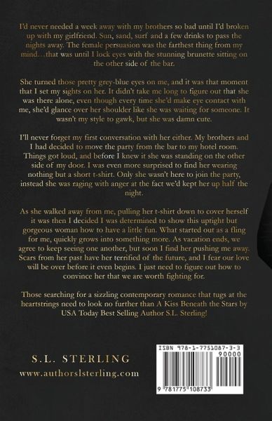 I'd never needed a week away with my brothers so bad until I'd broken up with my girlfriend. Sun, sand, surf and a few drinks to pass the nights away. The female persuasion was the farthest thing from my mind...that was until I lock eyes with the stunning brunette sitting on the other side of the bar. She turned those pretty grey-blue eyes on me, and it was that moment that I set my sights on her. It didn't take me long to figure out that she was there alone, even though every time she'd make eye contact with me, she'd glance over her shoulder like she was waiting for someone. It wasn't my style to gawk, but she was damn cute. I'll never forget my first conversation with her either. My brothers and I had decided to move the party from the bar to my hotel room. Things got loud, and before I knew it she was standing on the other side of my door. I was even more surprised to find her wearing nothing but a short t-shirt. Only she wasn't here to join the party, instead she was raging with anger at the fact we'd kept her up half the night. As she walked away from me, pulling her t-shirt down to cover herself it was then I decided I was determined to show this uptight but gorgeous woman how to have a little fun. What started out as a fling for me, quickly grows into something more. As vacation ends, we agree to keep seeing one another, but soon I find her pushing me away. Scars from her past have her terrified of the future, and I fear our love will be over before it even begins. I just need to figure out how to convince her that we are worth fighting for. Those searching for a sizzling contemporary romance that tugs at the heartstrings need to look no further than A Kiss Beneath the Stars by USA Today Best Selling Author S.L. Sterling!
