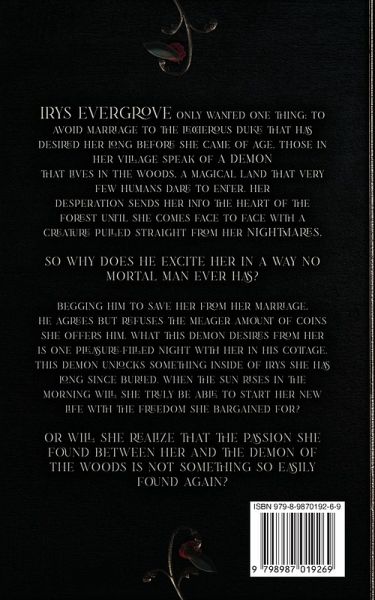 Irys Evergrove only wanted one thing: to avoid marriage to the lecherous duke that has desired her long before she came of age. Those in her village speak of a demon that lives in The Woods, a magical land that very few humans dare to enter. Her desperation sends her into the heart of the forest until she comes face to face with a creature pulled straight from her nightmares. So why does he excite her in a way no mortal man ever has? Begging him to save her from her marriage he agrees but refuses the meager amount of coins she offers him. What this demon desires from her is one pleasure-filled night with her in his cottage. This demon unlocks something inside of Irys she has long since buried. When the sun rises in the morning will she truly be able to start her new life with the freedom she bargained for? Or will she realize that the passion she found between her and the demon of The Woods is not something so easily found again? This is a less than 20k words novella about a monster and a human that is all spice and not plot. For a full list of tropes and other information please check the author's website.