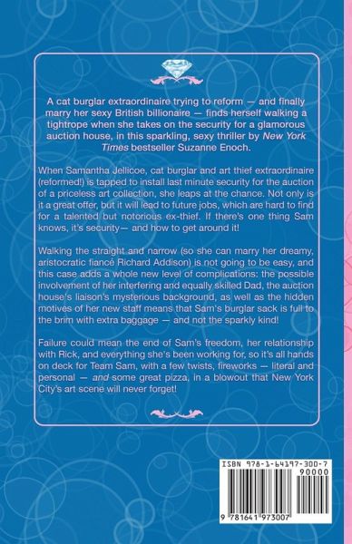 A cat burglar extraordinaire trying to reform - and finally marry her sexy British billionaire - finds herself walking a tightrope when she takes on the security for a glamorous auction house, in this sparkling, sexy thriller by New York Times bestseller Suzanne Enoch. When Samantha Jellicoe, cat burglar and art thief extraordinaire (reformed!) is tapped to install last minute security for the auction of a priceless art collection, she leaps at the chance. Not only is it a great offer, but it will lead to future jobs, which are hard to find for a talented but notorious ex-thief. If there's one thing Sam knows, it's security- and how to get around it! Walking the straight and narrow (so she can marry her dreamy, aristocratic fiancé Richard Addison) is not going to be easy, and this case adds a whole new level of complications: the possible involvement of her interfering and equally skilled Dad, the auction house's liaison's mysterious background, as well as the hidden motives of her new staff means that Sam's burglar sack is full to the brim with extra baggage - and not the sparkly kind! Failure could mean the end of Sam's freedom, her relationship with Rick, and everything she's been working for, so it's all hands on deck for Team Sam, with a few twists, fireworks - literal and personal - and some great pizza, in a blowout that New York City's art scene will never forget!