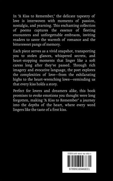 In "A Kiss to Remember," the delicate tapestry of love is interwoven with moments of passion, nostalgia, and yearning. This enchanting collection of poems captures the essence of fleeting encounters and unforgettable embraces, inviting readers to savor the warmth of romance and the bittersweet pangs of memory. Each piece serves as a vivid snapshot, transporting you to stolen glances, whispered secrets, and heart-stopping moments that linger like a soft caress long after they've passed. Through rich imagery and evocative language, the poet explores the complexities of love-from the exhilarating highs to the heart-wrenching lows-reminding us that every kiss holds a story. Perfect for lovers and dreamers alike, this book promises to evoke emotions you thought were long forgotten, making "A Kiss to Remember" a journey into the depths of the heart, where every word lingers like the taste of a first kiss.