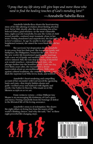 I pray that my life story will give hope and move those who need to find the healing touches of God’s mending love! —Annabelle Sabella-Reza Annabelle Sabella-Reza shares the heart-moving story of her life-altering revelation about finding absolute love. Set in 1960, shortly after the devastating loss of her beloved father; grief-stricken—in the most vulnerable time, eight-year-old Annabelle, became the victim of child sexual assaults—endured more traumatic abuse in her teens. Feeling abandoned and unprotected, she lost faith in love’s existence. At age 16, unable to deal with heightened torment, she aimed the razor blade and slit her wrist. She survived, but desperation drove Annabelle to run away from her dark past. She leaves her family and birthplace, the Philippines, bound for the USA. There in the new world, life transformed significantly: marriage with a new set of family and motherhood—where much of love infused. Still, the non-stop trouncing of shameful acts would resurface—intensifying each time—she plunges further into the heartless world. Until one day, over thirty years after, she encountered a divine intervention about unconditional love. With valor against cultural traditions, she continued to seek… and finds the supreme God Who loves, heals, and restores. Annabelle’s heart-rendering and compelling account of her encounter with God unveil the agonizing hurts and pain—that deeply hidden shame and guilt—washed away and replaced with dignity and worth. Our Father in Heaven, Who made us in His likeness accepts us as we are. From victim to victory—A Kiss Without Any Shame is an encouraging life testimony of God’s grace and mercy. Freeing Annabelle from the bondage of defeat to the liberated life of His loving assurance. Annabelle’s story is of redemption. She shares the eight pillars on living free from the snares of the world’s limiting choices. And why she said, "Yes" to these eight powerful life-changing steps.