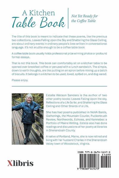 The title of this book is meant to indicate that these poems, like the previous two collections, Leaves Falling Upon the Sky and Shattering the Glass Ceiling, are about ordinary events in ordinary people's lives written in conversational language. It's not erudite enough to be a coffee table book A coffee table book usually holds professional prize winning photos or profound formal essays. That is not this book. This book can comfortably sit on a kitchen table to be opened over breakfast coffee or perused with a lunch sandwich. The simple, down to earth thoughts, are like putting on an apron before mixing up a batch of biscuits. It belongs in a kitchen to be used, loved, spilled on, and dog-eared. Please enjoy.
