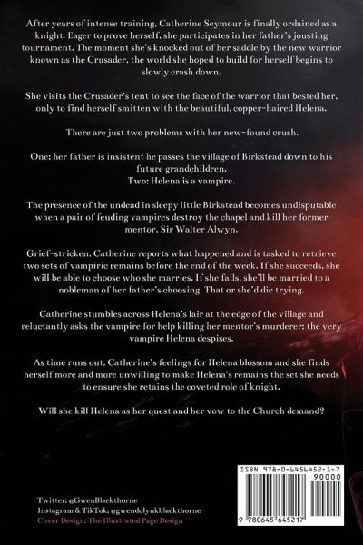 After years of intense training, Catherine Seymour is finally ordained as a knight. Eager to prove herself, she participates in her father's jousting tournament. The moment she's knocked out of her saddle by the new warrior known as the Crusader, the world she hoped to build for herself begins to slowly crash down. She visits the Crusader's tent to see the face of the warrior that bested her, only to find herself smitten with the beautiful, copper-haired Helena. There are just two problems with her new-found crush. One; her father is insistent he passes the village of Birkstead down to his future grandchildren. Two; Helena is a vampire. The presence of the undead in sleepy little Birkstead becomes undisputable when a pair of feuding vampires destroy the chapel and kill her former mentor, Sir Walter Alwyn. Grief-stricken, Catherine reports what happened and is tasked to retrieve two sets of vampiric remains before the end of the week. If she succeeds, she will be able to choose who she marries. If she fails, she'll be married to a nobleman of her father's choosing. That or she'd die trying. Catherine stumbles across Helena's lair at the edge of the village and reluctantly asks the vampire for help killing her mentor's murderer; the very vampire Helena despises. As time runs out, Catherine's feelings for Helena blossom and she finds herself more and more unwilling to make Helena's remains the set she needs to ensure she retains the coveted role of knight. Will she kill Helena as her quest and her vow to the Church demand?