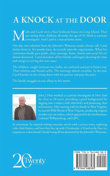 Mark and Carol own a four bedroom house on Long Island. They are raising three children, all under the age of 10. Mark is a private investigator. And Carol is a stay-at-home mom. One day, two solicitors from the Jehovah's Witnesses make a house call. Carol invites them in. Six months later, she secretly joins the organization. When her conversion finally goes public, their marriage, home, family and social life are almost destroyed. Carol abandons all her friends and begins devoting her time and energy to serving this new cause. The children, caught between two faiths, are confused and put in harms way. Their relatives and friends suffer. The marriage almost crumbles. In the end, Carol knocks on the wrong doors with her partner and pays the price. The family struggles to stay afloat in this storm. John J. Hart worked as a private investigator in New York for close to 20 years, providing a good background for digging into a subject with objectivity and producing clear information. After moving with his family to West Virginia, he started Wild Wood of West Virginia, producing original wooden toys on rockers, which appeared in the Smithsonian, Colonial Williamsburg, and QVC. In retirement, he enjoyed writing romantic novels with a serious twist, exploring cults, their history, and how they line up with Christianity. A Knock at the Door is a response to a close friend's family being all but destroyed by the Jehovah's Witnesses.