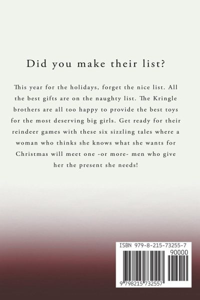 Did you make their list? This year for the holidays, forget the nice list. All the best gifts are on the naughty list. The Kringle brothers are all too happy to provide the best toys for the most deserving big girls. Get ready for their reindeer games with these six sizzling tales where a woman who thinks she knows what she wants for Christmas will meet one -or more- men who give her the present she needs!