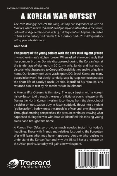 The picture of the young soldier with the ears sticking out graced my mother-in-law's kitchen forever. When asked, she would reply that her younger brother Donnie disappeared during the Korean War at the tender age of eighteen. In 2010, my wife, Sandy, and I set out to discover what happened to Corporal Donald Matney and to bring him home. Our journey took us to Washington, DC; Seoul, Korea; and many places in between. But slowly, carefully, step-by-step, we reconstructed the short life of Sandy's uncle Donnie, identified his remains, and returned him to rest by his mother's side in Missouri. A Korean War Odyssey is this story. The saga begins with a Korean history lesson told through the eyes of a fictional young refugee family fleeing the North Korean invasion. It continues from the viewpoint of a soldier on occupation duty in Japan suddenly thrust into a violent "police action". Both witness the atrocities of war until one disappears. Through alternating perspectives, the account continues weaving what happened during the war with how we identified this missing young soldier and brought him home. A Korean War Odyssey provides much needed insight for today's headlines. Those with friends and relatives lost during the Forgotten War will learn what may have happened. Anyone who desires to understand the Korean War and why the US still has a presence on this Asian peninsula today will gain a new viewpoint.