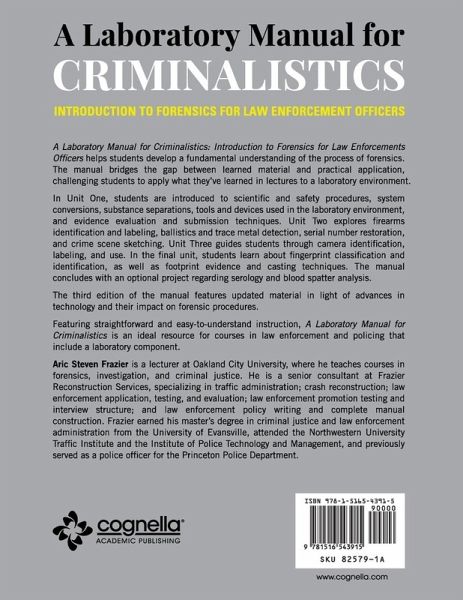 A Laboratory Manual for Criminalistics: Introduction to Forensics for Law Enforcement Officers helps students develop a fundamental understanding of the process of forensics. The manual bridges the gap between learned material and practical application, challenging students to apply what they've learned in lectures to a laboratory environment. In Unit One, students are introduced to scientific and safety procedures, system conversions, substance separations, tools and devices used in the laboratory environment, and evidence evaluation and submission techniques. Unit Two explores firearms identification and labeling, ballistics and trace metal detection, serial number restoration, and crime scene sketching. Unit Three guides students through camera identification, labeling, and use. In the final unit, students learn about fingerprint classification and identification, as well as footprint evidence and casting techniques. The manual concludes with an optional project regarding serology and blood spatter analysis. The third edition of the manual features updated material in light of advances in technology and their impact on forensic procedures. Featuring straightforward and easy-to-understand instruction, A Laboratory Manual for Criminalistics is an ideal resource for courses in law enforcement and policing that include a laboratory component. Aric Steven Frazier is a lecturer at Oakland City University, where he teaches courses in forensics, investigation, and criminal justice. He is a senior consultant at Frazier Reconstruction Services, specializing in traffic administration; crash reconstruction; law enforcement application, testing, and evaluation; law enforcement promotion testing and interview structure; and law enforcement policy writing and complete manual construction. Frazier earned his master's degree in criminal justice and law enforcement administration from the University of Evansville, attended the Northwestern University Traffic Institute and the Institute of Police Technology and Management, and previously served as a police officer for the Princeton Police Department.