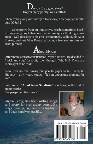 A Lad From Sardinia The Adventures of Morgan Harmony (YA) The year is 1622. Morgan Harmony, along with his young brother and their Aunt Harmy, boards a square-rigged warship, captained by his great uncle Willum. The ship is commissioned by the high courts of Spain to rid the Mediterranean Sea of pirates, to make the Med safe for commercial trade, and to give aid to any in need on the waters. The Age of Sail comes alive as every day brings new adventures, dangers, new lessons to learn . . . and of course, maturity. Miss Roseanna Lynn, a lass pulled from the sea - having escaped her pirate captors, becomes Morgan's compelling and close friend; together they become skilled in the ways of the sea . . . and budding love. The story is a page-turner from start to finish, with just the right mix of adventure, dangers, romance, ethics, and humor. Will be enjoyed by readers of all ages . . . and it's all set in verse! So, come along! Have your cutlass at the ready, your flintlock secure in your belt! Join Morgan and the crew as they battle pirates, listen to Aunt Harmy explain scriptural principles to a rowdy crew, visit various ports of call from the western side of Italy to Gibralter and beyond.