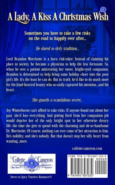 Sometimes you have to take a few risks on the road to happily ever after... He dared to defy tradition... Lord Brandon Morrisette is a born risk-taker. Instead of claiming his place in society, he became a physician to help the less fortunate. So, when he sees a patient mistreating her sweet, bright-eyed companion, Brandon is determined to help bring some holiday cheer into the poor girl's life. It's the least he can do. But in truth, he'd like to do much more for the kind-hearted beauty who so easily captured his attention...and his heart. She guards a scandalous secret... Joy Winterborne can't afford to take risks. If anyone found out about her past, she'd lose everything. And getting fired from her companion job would deprive her of the only bright spot in her otherwise dreary life-the time she gets to spend with the charming and oh-so-handsome Dr. Morrisette. Of course, nothing can ever come of her attraction to him. He's nobility, and she's nobody. But that doesn't stop her silly heart from wanting...more. With a little luck, some mistletoe, and maybe even a Christmas wish, can Brandon convince Joy to take the greatest risk of all-falling in love? Secret, scandals, and sigh-worthy romance. This historical holiday romance by a USA Today bestselling author will have you cheering Brandon and Joy on to their much-deserved merry Christmas and happily-ever-after. If you enjoy reading lovable rogues, class difference, and opposites attract historical romances with a pinch of mystery, a dash of humor, and soul-searing emotion, then you'll adore Collette Cameron's captivating DAUGHTERS OF DESIRE (SCANDALOUS LADIES) SERIES. Settle into your favorite reading nook with your favorite beverage for a page-turning, entertaining Regency world adventure you can't put down. Though this book can easily be read as a stand-alone, most readers prefer to read the series in order. DAUGHTERS OF DESIRE: A Lady, A Kiss, A Christmas Wish No Lady for the Lord Love Lessons for a Lady His One and Only Lady Never a Proper Lady Lady Tempts a Rogue CHECK OUT COLLETTE'S OTHER SERIES: Chronicles of the Westbrook Brides Daughters of Disgrace: Secrets of Scandalous Ladies Dukes Come Calling Heart of a Scot For the Love of an Earl (Wicked Earls' Club) Ladies of Opportunity The Culpepper Misses The Honorable Rogues®