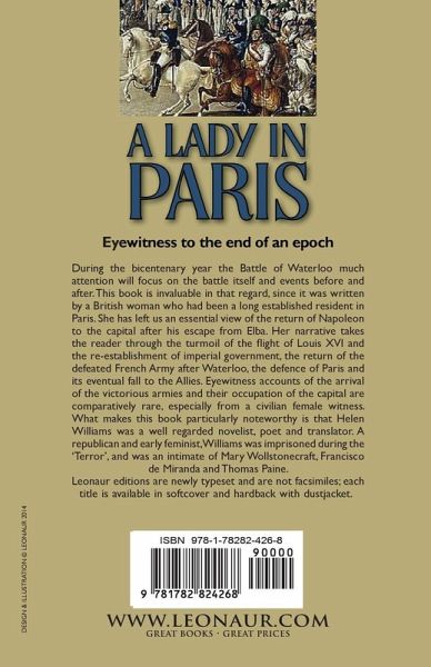 Eyewitness to the end of an epoch During the bicentenary year the Battle of Waterloo much attention will focus on the battle itself and events before and after. This book is invaluable in that regard, since it was written by a British woman who had been a long established resident in Paris. She has left us an essential view of the return of Napoleon to the capital after his escape from Elba. Her narrative takes the reader through the turmoil of the flight of Louis XVI and the re-establishment of imperial government, the return of the defeated French Army after Waterloo, the defence of Paris and its eventual fall to the Allies. Eyewitness accounts of the arrival of the victorious armies and their occupation of the capital are comparatively rare, especially from a civilian female witness. What makes this book particularly noteworthy is that Helen Williams was a well regarded novelist, poet and translator. A republican and early feminist, Williams was imprisoned during the 'Terror', and was an intimate of Mary Wollstonecraft, Francisco de Miranda and Thomas Paine. Leonaur editions are newly typeset and are not facsimiles; each title is available in softcover and hardback with dustjacket.
