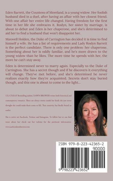 Eden Barrett, the Countess of Moreland, is a young widow. Her foolish husband died in a duel, after having an affair with her closest friend. With one affair her entire life changed. Having freedom for the first time in her life she embraces it. Roslyn, her sister by marriage, is about to debut and Eden is her chaperone, and she's determined to aid her to find a husband that won't disappoint her. Maxwell Holden, the Duke of Carrington has decided it is time to find himself a wife. He has a list of requirements and Lady Roslyn Barrett is the perfect candidate. There is only one problem: her chaperone. Something about her is oddly familiar, and he's more drawn to the young widow than he likes. The more time he spends with her, the more he can't stay away. Eden is determined never to marry again. Especially to the Duke of Carrington. She has a secret though and if he discovers it everything will change. They've met before, and she's determined he never realizes exactly how they're acquainted. Secrets don't stay buried though, and this one is about to come to the light¿