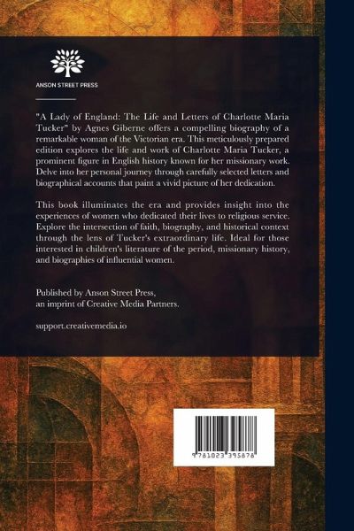 "A Lady of England: The Life and Letters of Charlotte Maria Tucker" by Agnes Giberne offers a compelling biography of a remarkable woman of the Victorian era. This meticulously prepared edition explores the life and work of Charlotte Maria Tucker, a prominent figure in English history known for her missionary work. Delve into her personal journey through carefully selected letters and biographical accounts that paint a vivid picture of her dedication. This book illuminates the era and provides insight into the experiences of women who dedicated their lives to religious service. Explore the intersection of faith, biography, and historical context through the lens of Tucker's extraordinary life. Ideal for those interested in children's literature of the period, missionary history, and biographies of influential women. This work has been selected by scholars as being culturally important, and is part of the knowledge base of civilization as we know it. This work is in the public domain in the United States of America, and possibly other nations. Within the United States, you may freely copy and distribute this work, as no entity (individual or corporate) has a copyright on the body of the work. Scholars believe, and we concur, that this work is important enough to be preserved, reproduced, and made generally available to the public. We appreciate your support of the preservation process, and thank you for being an important part of keeping this knowledge alive and relevant.