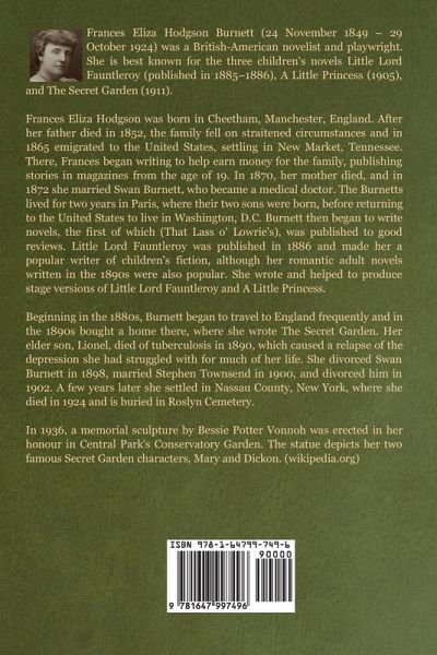 Frances Eliza Hodgson Burnett (24 November 1849 – 29 October 1924) was a British-American novelist and playwright. She is best known for the three children's novels Little Lord Fauntleroy (published in 1885–1886), A Little Princess (1905), and The Secret Garden (1911). Frances Eliza Hodgson was born in Cheetham, Manchester, England. After her father died in 1852, the family fell on straitened circumstances and in 1865 emigrated to the United States, settling in New Market, Tennessee. There, Frances began writing to help earn money for the family, publishing stories in magazines from the age of 19. In 1870, her mother died, and in 1872 she married Swan Burnett, who became a medical doctor. The Burnetts lived for two years in Paris, where their two sons were born, before returning to the United States to live in Washington, D.C. Burnett then began to write novels, the first of which (That Lass o' Lowrie's), was published to good reviews. Little Lord Fauntleroy was published in 1886 and made her a popular writer of children's fiction, although her romantic adult novels written in the 1890s were also popular. She wrote and helped to produce stage versions of Little Lord Fauntleroy and A Little Princess. Beginning in the 1880s, Burnett began to travel to England frequently and in the 1890s bought a home there, where she wrote The Secret Garden. Her elder son, Lionel, died of tuberculosis in 1890, which caused a relapse of the depression she had struggled with for much of her life. She divorced Swan Burnett in 1898, married Stephen Townsend in 1900, and divorced him in 1902. A few years later she settled in Nassau County, New York, where she died in 1924 and is buried in Roslyn Cemetery. In 1936, a memorial sculpture by Bessie Potter Vonnoh was erected in her honour in Central Park's Conservatory Garden. The statue depicts her two famous Secret Garden characters, Mary and Dickon. (wikipedia.org)