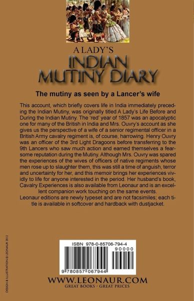 The mutiny as seen by a Lancer's wife This account, which briefly covers life in India immediately preceding the Indian Mutiny, was originally titled A Lady's Life Before and During the Indian Mutiny. The 'red' year of 1857 was an apocalyptic one for many of the British in India and Mrs. Ouvry's account as she gives us the perspective of a wife of a senior regimental officer in a British Army cavalry regiment is, of course, harrowing. Henry Ouvry was an officer of the 3rd Light Dragoons before transferring to the 9th Lancers who saw much action and earned themselves a fearsome reputation during the Mutiny. Although Mrs. Ouvry was spared the experiences of the wives of officers of native regiments whose men rose up to slaughter them, this was still a time of anguish, terror and uncertainty for her, and this memoir brings her experiences vividly to life for anyone interested in the period. Her husband's book, Cavalry Experiences is also available from Leonaur and is an excellent companion work touching on the same events. Leonaur editions are newly typeset and are not facsimiles; each title is available in softcover and hardback with dustjacket.