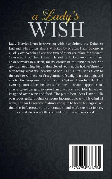 Lady Harriet Lynn is traveling with her father, the Duke, to England, when their ship is attacked by pirates. Their defense is quickly overwhelmed and the two of them are taken for ransom. Separated from her father, Harriet is locked away with her chambermaid in a dank, musty corner of the pirate vessel. She spends harrowing days in that closed room at the hold of the ship, wondering what will become of her. That is, until she's taken to the deck to witness her first glimmer of sunlight in a fortnight and meets the imposing, mysterious Captain Bloodworth. One evening soon after, he sends for her to share supper in his quarters, and she gets to know him in ways she couldn't have ever imagined over wine and food. The pirate bewilders Harriet. His courteous, gallant behavior seems incompatible with his criminal ways, and his handsome features conspire to breed feelings in her that she isn't prepared to understand and can't seem to ignore, even if she knows they should never have blossomed.