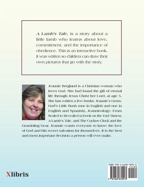 A Lamb's Tale, is a story about a little lamb who learns about love, commitment, and the importance of obedience. This is an interactive book. It was written so children can draw their own pictures that go with the story.