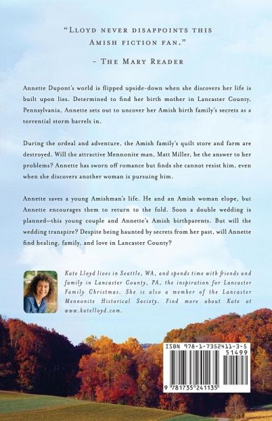 Thanks to a DNA test, Annette Dupont's world is flipped upside-down when she discovers her life is built upon lies. Not that she doesn't harbor her own secrets that haunt her. Determined to find her birthmother in Lancaster County, PA, she uncovers her Amish family's secrets as a torrential storm barrels in. During the ordeal and adventure, the Amish family's quilt store and farm are destroyed. Annette meets an attractive Mennonite, Matt Miller, who helps her. Annette has sworn off men but finds she cannot resist him, even when she discovers another woman is pursuing him. Annette saves a young Amishman's life. He and an Amish woman elope, but Annette encourages them to return to the fold. Soon, a double wedding is planned-this young couple and Annette's Amish birthparents. In the end, will Annette find healing, family, and love?