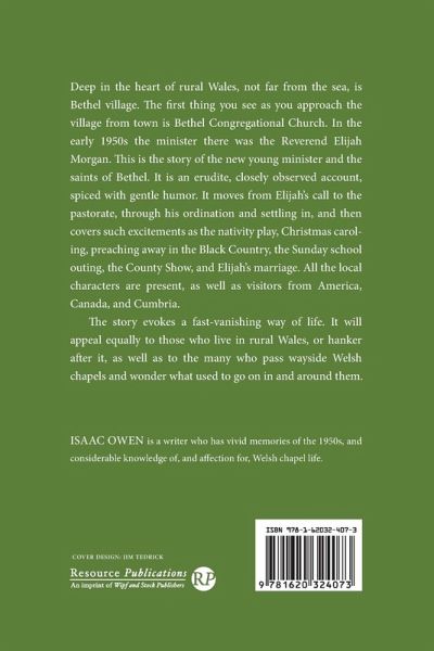Deep in the heart of rural Wales, not far from the sea, is Bethel village. The first thing you see as you approach the village from town is Bethel Congregational Church. In the early 1950s the minister there was the Reverend Elijah Morgan. This is the story of the new young minister and the saints of Bethel. It is an erudite, closely observed account, spiced with gentle humour. It moves from Elijah's call to the pastorate, through his ordination and settling in, and then covers such excitements as the nativity play, Christmas caroling, preaching away in the Black Country, the Sunday School outing, the County Show, and Elijah's marriage. All the local characters are present, as well as visitors from America, Canada, and Cumbria. The story evokes a fast vanishing way of life. It will appeal equally to those who live in rural Wales, or hanker after it, as well as to the many who pass wayside Welsh chapels and wonder what used to go on in and around them.