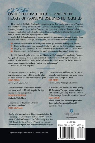 Just the mention of his name brings smiles to the faces of sports fans everywhere. Landry: The Legend and the Legacy is a tribute to the man behind the hat, the look, and the game. In rich texture, Bob St. John tells the story of a quiet kid from Mission, Texas, who grew up to be a quiet, intense, and respected man. Favorite memories of Landry are shared by others who knew him as a person and as a friend: Dan Reeves, Mike Ditka, Charlie Waters, Bob Lilly, Charles Swindoll, Roger Staubach, Drew Pearson. Pictures from throughout Landry's career and recollections from friends and fellow players help depict the man who molded lives and changed the course of football forever.