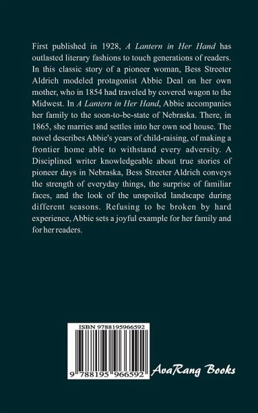 First published in 1928, A Lantern in Her Hand has outlasted literary fashions to touch generations of readers. In this classic story of a pioneer woman, Bess Streeter Aldrich modeled protagonist Abbie Deal on her own mother, who in 1854 had traveled by covered wagon to the Midwest. In A Lantern in Her Hand, Abbie accompanies her family to the soon-to-be-state of Nebraska. There, in 1865, she marries and settles into her own sod house. The novel describes Abbie's years of child-raising, of making a frontier home able to withstand every adversity. A Disciplined writer knowledgeable about true stories of pioneer days in Nebraska, Bess Streeter Aldrich conveys the strength of everyday things, the surprise of familiar faces, and the look of the unspoiled landscape during different seasons. Refusing to be broken by hard experience, Abbie sets a joyful example for her family and for her readers.