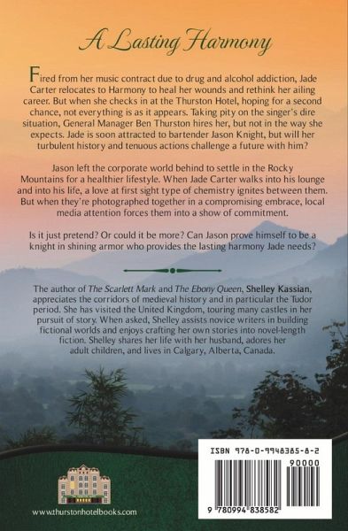 A country music star finds a lasting harmony in this second chance love story. Fired from her music contract due to drug and alcohol addiction, Jade Carter relocates to Harmony to heal her wounds and rethink her ailing career. But when she checks in at the Thurston Hotel, hoping for a second chance, not everything is as it appears. Taking pity on the singer’s dire situation, General Manager Ben Thurston hires her, but not in the way she expects. Jade is soon attracted to bartender Jason Knight, but will her turbulent history and tenuous actions challenge a future with him? Jason left the corporate world behind to settle in the Rocky Mountains for a healthier lifestyle. When Jade Carter walks into his lounge and into his life, a love at first sight type of chemistry ignites between them. But when they’re photographed together in a compromising embrace, local media attention forces them into a show of commitment. Is it just pretend? Or could it be more? Can Jason prove himself to be a knight in shining armor who provides the lasting harmony Jade needs? This is book 5 (warm) in the 12 book Thurston Hotel Series of sweet to warm, stand-alone, contemporary romance novels, connected by common settings, characters, and events.