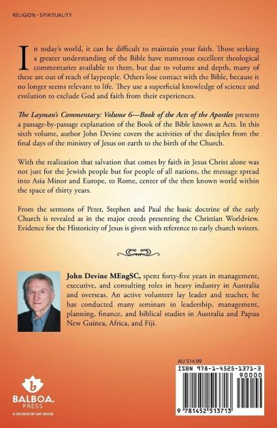 In today's world, it can be difficult to maintain your faith. Those seeking a greater understanding of the Bible have numerous excellent theological commentaries available to them, but due to volume and depth, many of these are out of reach of laypeople. Others lose contact with the Bible, because it no longer seems relevant to life. They use a superficial knowledge of science and evolution to exclude God and faith from their experiences. The Layman's Commentary: Volume 6-Book of the Acts of the Apostles presents a passage-by-passage explanation of the Book of the Bible known as Acts. In this sixth volume, author John Devine covers the activities of the disciples from the final days of the ministry of Jesus on earth to the birth of the Church. With the realization that salvation that comes by faith in Jesus Christ alone was not just for the Jewish people but for people of all nations, the message spread into Asia Minor and Europe, to Rome, centre of the then known world within the space of thirty years. From the sermons of Peter, Stephen and Paul the basic doctrine of the early Church is revealed as in the major creeds presenting the Christian Worldview. Evidence for the Historicity of Jesus is given.