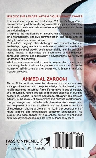 Unlock the Leader Within. Your Legacy Awaits In a world yearning for true leadership, A Leader's Legacy is a transformative guidebook offering invaluable insights, empowering individuals to embrace their innate leadership potential and leave an enduring legacy. For those aspiring to become great innovative senior leaders and change advocates, through practical strategies, practices, and actions, to accelerate and achieve advancement in their career goals. Exploring the significance of integrity, ethical decision-making, time management, effective communication, resilience, and the ability to cultivate a shared vision, A Leader's Legacy challenges conventional notions of leadership, urging readers to embrace a holistic approach that integrates personal growth, social responsibility, and the pursuit of lasting impact. This book illuminates the importance of self-reflection, continuous learning, and adaptability in navigating the ever-evolving landscapes of leadership. Whether you aspire to lead a team, an organization, or an entire community, this book will inspire you to embark on a transformative journey of self-discovery and empower you to leave an enduring mark on the world. Ahmed Al Zarooni brings over two decades of experience across a range of sectors, with deep knowledge in the banking and health insurance industries. Ahmed's narrative is one of mastery and innovation, honed through deep-rooted expertise in building exceptional leaders, to driving operational efficiency. His prowess extends to the realms of environment and mindset transformation, change management, multi-channel optimization, risk management, and the pursuit of cultural excellence. He has pioneered a culture of excellence, placing a premium on both the development of future leaders and unparalleled customer experiences. Ahmed's journey has been shaped by a relentless pursuit of enhancing both industry landscapes and the lives of those they touch.