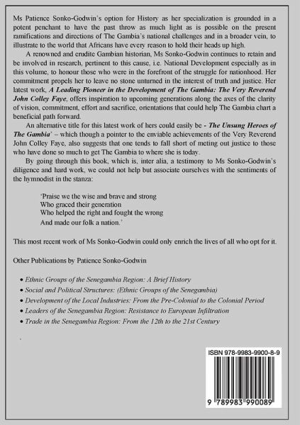 This work, A Leading Pioneer in the Development of The Gambia: The Very Reverend John Colley Faye, offers inspiration to upcoming generations along the axes of the clarity of vision, commitment, effort and sacrifice, orientations that could help The Gambia chart a beneficial path forward. Patience Sonko-Godwin is a renowned and erudite Gambian historian. She continues to retain and be involved in research pertinent to National Development and to honour those who were in the forefront of the struggle for nationhood. Other Publications include: Ethnic Groups of the Senegambia Region: A Brief History and Trade in the Senegambia Region: From the 12th to the 21st Century.