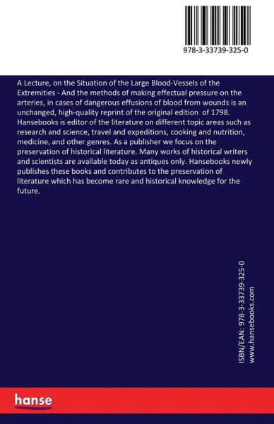 A Lecture, on the Situation of the Large Blood-Vessels of the Extremities - And the methods of making effectual pressure on the arteries, in cases of dangerous effusions of blood from wounds is an unchanged, high-quality reprint of the original edition of 1798.