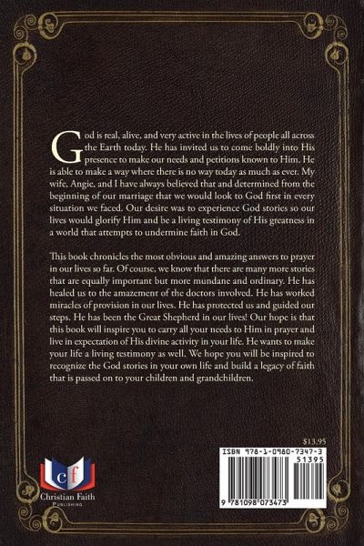 God is real, alive, and very active in the lives of people all across the Earth today. He has invited us to come boldly into His presence to make our needs and petitions known to Him. He is able to make a way where there is no way today as much as ever. My wife, Angie, and I have always believed that and determined from the beginning of our marriage that we would look to God first in every situation we faced. Our desire was to experience God stories so our lives would glorify Him and be a living testimony of His greatness in a world that attempts to undermine faith in God. This book chronicles the most obvious and amazing answers to prayer in our lives so far. Of course, we know that there are many more stories that are equally important but more mundane and ordinary. He has healed us to the amazement of the doctors involved. He has worked miracles of provision in our lives. He has protected us and guided our steps. He has been the Great Shepherd in our lives! Our hope is that this book will inspire you to carry all your needs to Him in prayer and live in expectation of His divine activity in your life. He wants to make your life a living testimony as well. We hope you will be inspired to recognize the God stories in your own life and build a legacy of faith that is passed on to your children and grandchildren.