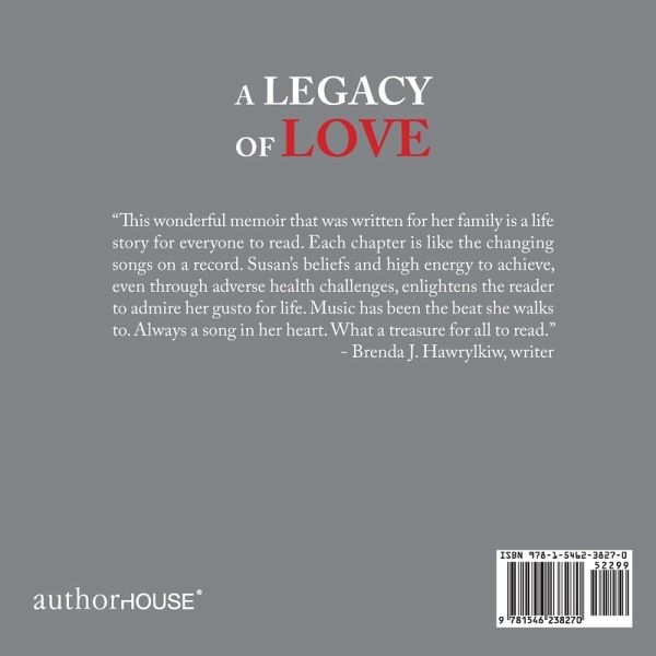 This wonderful memoir that was written for her family is a life story for everyone to read. Each chapter is like the changing songs on a record. Susans beliefs and high energy to achieve, even through adverse health challenges, enlightens the reader to admire her gusto for life. Music has been the beat she walks to. Always a song in her heart. What a treasure for all to read (Brenda J. Hawnylkin, writer).
