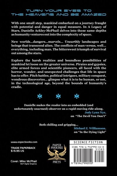 Turn your eyes to the heavens and be amazed… With one small step, mankind embarked on a journey fraught with potential and danger in equal measure. In A Legacy of Stars, Danielle Ackley-McPhail delves into those same depths as humanity ventures out into the complexity of space. New worlds…dangers…marvels… Unearthly landscapes and beings that transcend alien. The conflicts of man versus, well… everything, including man. The bittersweet triumph of survival out among the stars. Explore the harsh realities and boundless possibilities of mankind let loose on the greater universe. Pirates and gypsies, elite armed forces and scientific pioneers, all faced with the horror, wonder, and unexpected challenges that life in space has to offer. Pitch battles, political intrigues, military conquest, wondrous discoveries… glimpse what it is to be human, or not, in the technological age, beyond the bounds of humanity’s cradle.