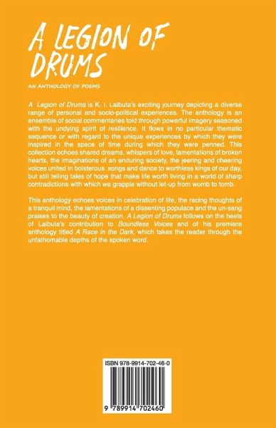 A Legion of Drums is K. I. Laibuta's exciting journey depicting a diverse range of personal and socio-political experiences. The anthology is an ensemble of social commentaries told through powerful imagery seasoned with the undying spirit of resilience. It flows in no particular thematic sequence or with regard to the unique experiences by which they were inspired in the space of time during which they were penned. This collection echoes shared dreams, whispers of love, lamentations of broken hearts, the imaginations of an enduring society, the jeering and cheering voices united in boisterous songs and dance to worthless kings of our day, but still telling tales of hope that make life worth living in a world of sharp contradictions with which we grapple without let-up from womb to tomb. This anthology echoes voices in celebration of life, the racing thoughts of a tranquil mind, the lamentations of a dissenting populace and the un-sang praises to the beauty of creation. A Legion of Drums follows on the heels of Laibuta's contribution to Boundless Voices and of his premiere anthology titled A Race in the Dark, which takes the reader through the unfathomable depths of the spoken word.