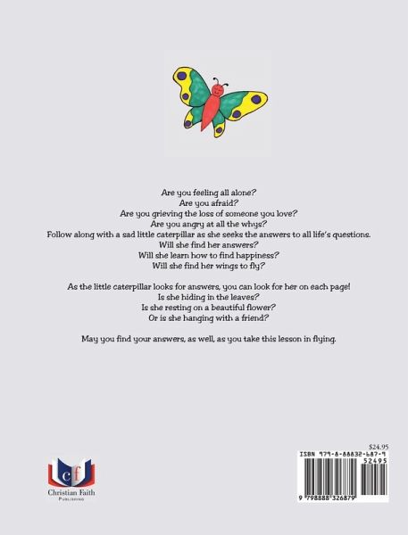 Are you feeling all alone? Are you afraid? Are you grieving the loss of someone you love? Are you angry at all the whys? Follow along with a sad little caterpillar as she seeks the answers to all life's questions. Will she find her answers? Will she learn how to find happiness? Will she find her wings to fly? As the little caterpillar looks for answers, you can look for her on each page! Is she hiding in the leaves? Is she resting on a beautiful flower? Or is she hanging with a friend? May you find your answers, as well, as you take this lesson in flying.