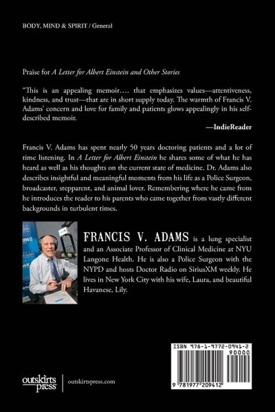 Peter Miller Loved To Talk And When He Mentioned Meeting Albert Einstein I Had To Listen Francis V. Adams has spent nearly 50 years doctoring patients and a lot of time listening. In A Letter for Albert Einstein he shares some of what he has heard as well as his thoughts on the current state of medicine. Dr. Adams also describes insightful and meaningful moments from his life as a Police Surgeon, broadcaster, stepparent, and animal lover. Remembering where he came from, he introduces the reader to his parents who came together from vastly different backgrounds in turbulent times.