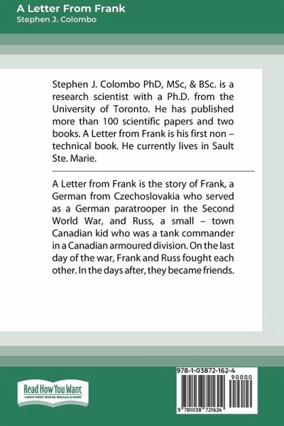 A Letter from Frank is the story of Frank, a German from Czechoslovakia who served as a German paratrooper in the Second World War, and Russ, a small-town Canadian kid who was a tank commander in a Canadian armoured division. On the last day of the war, Frank and Russ fought each other. In the days after, they became friends.