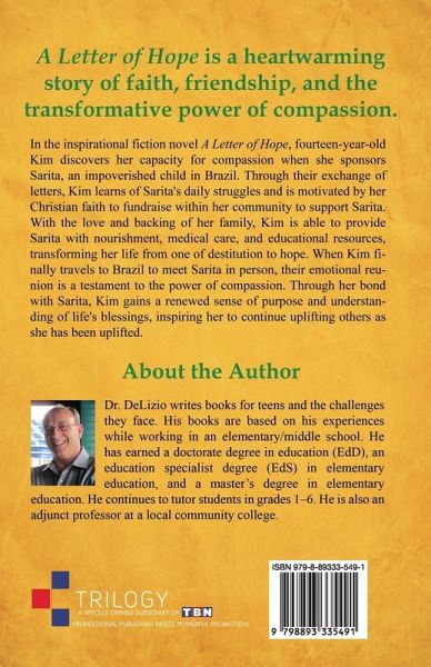A Letter of Hope is a heartwarming story of faith, friendship, and the transformative power of compassion. In the inspirational fiction novel A Letter of Hope, fourteen-year-old Kim discovers her capacity for compassion when she sponsors Sarita, an impoverished child in Brazil. Through their exchange of letters, Kim learns of Sarita's daily struggles and is motivated by her Christian faith to fundraise within her community to support Sarita. With the love and backing of her family, Kim is able to provide Sarita with nourishment, medical care, and educational resources, transforming her life from one of destitution to hope. When Kim finally travels to Brazil to meet Sarita in person, their emotional reunion is a testament to the power of compassion. Through her bond with Sarita, Kim gains a renewed sense of purpose and understanding of life's blessings, inspiring her to continue uplifting others as she has been uplifted.