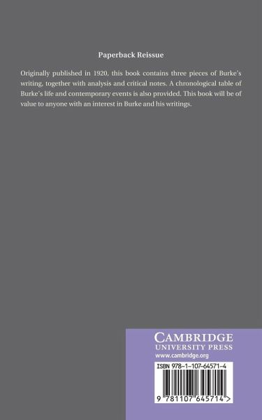 Originally published in 1920, this book contains three pieces of Burke's writing, together with analysis and critical notes. A chronological table of Burke's life and contemporary events is also provided. This book will be of value to anyone with an interest in Burke and his writings.