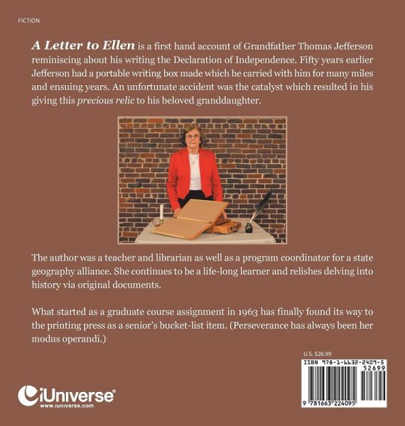A Letter to Ellen is a first hand account of Grandfather Thomas Jefferson remincing about his writing the Declaration of Independence. Fifty years earlier Jefferson had a portable writing box made which he carried with him for many miles and ensuing years. An unfortunate accident was the catalyst which resulted in his giving this precious relic to his beloved granddaughter.