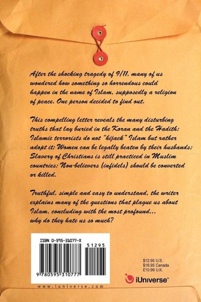 After the shocking tragedy of 9/11, many of us wondered how something so horrendous could happen in the name of Islam, supposedly a religion of peace. One person decided to find out. This compelling letter reveals the many disturbing truths that lay buried in the Koran and the Hadith: Islamic terrorists do not "hijack" Islam but rather adopt it; Women can be legally beaten by their husbands; Slavery of Christians is still practiced in Muslim countries; Non-believers (infidels) should be converted or killed. Truthful, simple and easy to understand, the writer explains many of the questions that plague us about Islam, concluding with the most profound--why do they hate us so much?