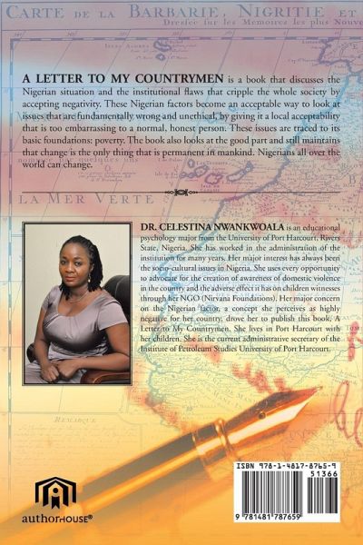 A Letter to My Countrymen is a book that discusses the Nigerian situation and the institutional flaws that cripple the whole society by accepting negativity. These Nigerian factors become an acceptable way to look at issues that are fundamentally wrong and unethical, by giving it a local acceptability that is too embarrassing to a normal, honest person. These issues are traced to its basic foundations: poverty. The book also looks at the good part and still maintains that change is the only thing that is permanent in mankind. Nigerians all over the world can change.