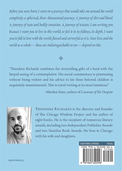 Before you were born, I went on a journey that would take me around the world completely, a spherical, three-dimensional journey. A journey of dirt and blood. A journey of taste and bodily sensation. A journey of texture. I am writing you because I want you to live in this world, to feel it in its fullness, its depth. I want you to fall in love with the world, flawed and sorrowful as it is. Your lives and the world as a whole-these are indistinguishable to me-depend on this. "Theodore Richards combines the storytelling gifts of a bard with the limpid seeing of a contemplative. His social commentary is penetrating without being violent and his advice to his three beloved children is exquisitely unsentimental. This is travel writing at its most luminous." -Mirabai Starr, author of Caravan of No Despair