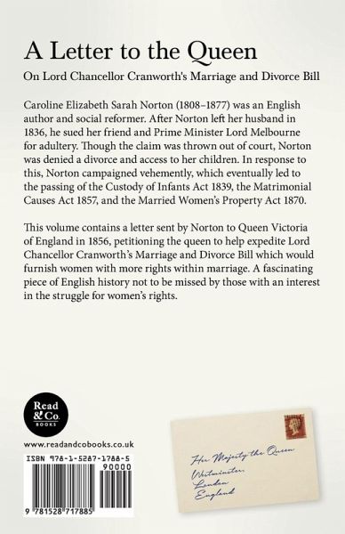 Caroline Elizabeth Sarah Norton (1808¿1877) was an English author and social reformer. After Norton left her husband in 1836, he sued her friend and Prime Minister Lord Melbourne for adultery. Though the claim was thrown out of court, Norton was denied a divorce and access to her children. In response to this, Norton campaigned vehemently, which eventually led to the passing of the Custody of Infants Act 1839, the Matrimonial Causes Act 1857, and the Married Women's Property Act 1870. This volume contains a letter sent by Norton to Queen Victoria of England in 1856, petitioning the queen to help expedite Lord Chancellor Cranworth's Marriage and Divorce Bill which would furnish women with more rights within marriage. A fascinating piece of English history not to be missed by those with an interest in the struggle for women's rights. Other notable works by this author include: ¿The Dandies Rout¿ (1825), ¿The Wife, and Woman's Reward¿ (1835), and ¿Stuart of Dunleath¿ (1851). Read & Co. Books is republishing this historic letter now in a new edition complete with a specially-commissioned new biography of the author.