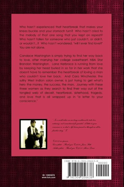 The lives of three beautiful women converge at the exclusive Salon De Cara-Lana Harbrace, a highly successful prosecutor, Cara Winchester- the beautiful Salon owner and stylist, and Candace Washington- "the basketball wife" and mother of two. They form a connection around the hope and possibility of true love and negotiating the heartbreaks of unsuccessful relationships. But the trials of love and heartbreak will not be the only "bond" they share. Journey- as "A Letter to Your Conscience" takes the reader through a tale of trauma, triumph, treachery, and a tragedy that will teach them all the true meaning of love. Journey-as the destinies of three women who yearn to simply be loved unfolds.