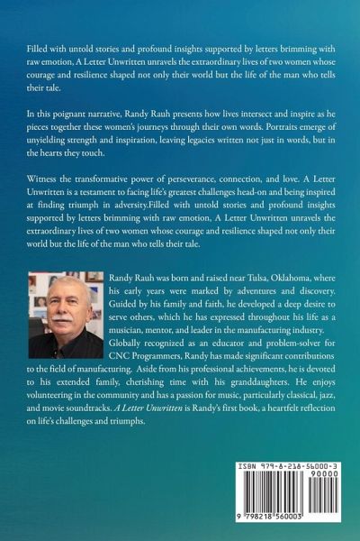 A Letter Unwritten is filled with untold stories, profound insights, and letters brimming with raw emotion. It unravels the extraordinary lives of two women whose courage and resilience shaped not only their world but also the life of the man who tells their tale. Through the letters they wrote and those written about them, their legacies unfold, revealing the depth of their struggles and the strength that carried them forward. In this poignant narrative, Randy Rauh delves into how lives intersect and inspire as he pieces together these women's journeys through their own words. With every letter, a tapestry of love, loss, and unyielding determination emerges, showcasing the transformative power of perseverance, connection, and love. A Letter Unwritten is more than a story; it is a testament to facing life's greatest challenges head-on and finding triumph in adversity. Told from the perspective of a man forever changed by their impact, the story unfolds in fragments-words inked on paper that hold the weight of untold emotions and timeless truths. As readers are drawn into the women's struggles and triumphs, they will witness the unbreakable connection that defined their lives and inspired a profound legacy. Each chapter invites reflection on the courage to rise above hardship and the enduring impact of lives well lived. A Letter Unwritten offers a deeply moving exploration of how individuals shape and are shaped by one another. It celebrates resilience, love, and the threads of humanity that bind us all, leaving an indelible mark not just in words but in the hearts they touch. This story will inspire readers to find their own strength, honor their connections, and embrace the challenges that define them.