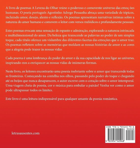 Immerse yourself in the profound depths of your most intimate emotions with A Leveza do Olhar, an exquisite collection that transcends the boundaries of love and illuminates its many facets. Portuguese poet Agostinho Adrego Pessanha masterfully guides readers on a transformative journey, offering a singular perspective on the enigmatic beauty of love through his stunning verses. Within the pages of this captivating collection, readers are beckoned to unravel the mysteries that lie within their hearts. Pessanha's poetic craftsmanship serves as a guiding light, unveiling the profound power of love as a catalyst for healing, embracing life's complexities, and discovering one's true purpose. Allow these eloquent poems to resonate deep within your soul, as they forge an intimate connection with the essence of love and existence. Each verse acts as a poignant brushstroke, painting a vivid tapestry that reflects the myriad hues of human experience. Through the prism of Pessanha's artistry, love becomes an ethereal force, capable of mending our deepest wounds and imbuing life with a renewed sense of meaning. The resplendent beauty of love knows no bounds and is accessible to all who dare to seek it. Within the pages of A Leveza do Olhar, readers embark on a profound inner journey, where love intertwines with self-discovery. Let this extraordinary collection guide you as you explore the depths of your heart and forge a deeper connection with the universal tapestry of human experience.