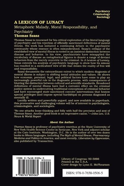 Thomas Szasz is renowned for his critical exploration of the literal language of psychiatry and his rejection of officially sanctioned definitions of mental illness. His work has initiated a continuing debate in the psychiatric community whose essence is often misunderstood. Szasz's critique of the established view of mental illness is rooted in an insistent distinction between disease and behavior. In his view, psychiatrists have misapplied the vocabulary of disease as metaphorical figures to denote a range of deviant behaviors from the merely eccentric to the criminal. In A Lexicon of Lunacy, Szasz extends his analysis of psychiatric language to show how its misuse has resulted in a medicalized view of life that denies the reality of free will and responsibility. Szasz documents the extraordinary extent to which modern diagnosis of mental illness is subject to shifting social attitudes and values. He shows how economic, personal, legal, and political factors have come to play an increasingly powerful role in the diagnostic process, with consequences of blurring the distinction between cultural and scientific standards. Broadened definitions of mental illness have had a corrosive effect on the criminal justice system in undercutting traditional conceptions of criminal behavior and have encouraged state-sanctioned coercive interventions that bestow special privileges (and impose special hardships) on persons diagnosed as mentally ill. Lucidly written and powerfully argued, and now available in paperback, this provocative and challenging volume will be of interest to psychologists, criminologists, and sociologists.