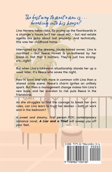 The best way to meet a man is . . . breaking into his house? Lina Herrera hates risks. So prying up the floorboards in a stranger's house isn't her usual MO - but real estate agents are jerks about lost property. And technically, this was her childhood home. Interrupted by the dreamy, tousle-haired owner, Lina is mortified - but Reece Howell is un-bothered by her break-in. Not that it matters. They're just two strangers...right? But when Lina's lukewarm situationship stands her up a week later, it's Reece who saves the night. New in town and with more in common with Lina than a shared crime scene, Reece's charm ignites an unlikely spark. But then a management change makes him Lina's new boss, and her aversion to risk puts Reece in the friendzone. As she struggles to find the courage to break her own rules, can Lina learn to trust her desires - both at work and in the bedroom? A sweet and steamy, first person POV, contemporary romance novel, A Liar and a Thief will sweep you off your feet.