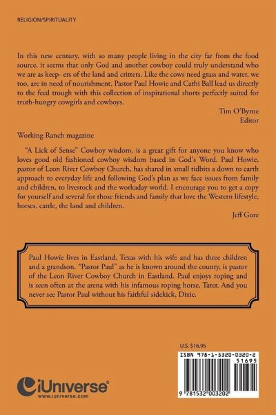 In this new century, with so many people living in the city far from the food source, it seems that only God and another cowboy could truly understand who we are as keep- ers of the land and critters. Like the cows need grass and water, we too, are in need of nourishment. Pastor Paul Howie and Cathi Ball lead us directly to the feed trough with this collection of inspirational shorts perfectly suited for truth-hungry cowgirls and cowboys. Tim O'Byrne Editor Working Ranch magazine ¿ "A Lick of Sense" Cowboy wisdom, is a great gift for anyone you know who loves good old fashioned cowboy wisdom based in God's Word. Paul Howie, pastor of Leon River Cowboy Church, has shared in small tidbits a down to earth approach to everyday life and following God's plan as we face issues from family and children, to livestock and the workaday world. I encourage you to get a copy for yourself and several for those friends and family that love the Western lifestyle, horses, cattle, the land and children. Jeff Gore