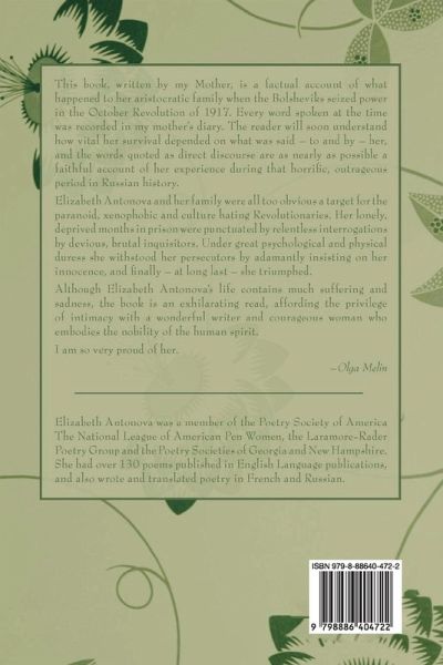 This book, written by my Mother, is a factual account of what happened to her aristocratic family when the Bolsheviks seized power in the October Revolution of 1.917. Every word spoken at the time was recorded in my mothers diary. The reader will soon understand how vital her survival depended on what was said - to and by - her, and the words quoted as direct discourse are as nearly as possible a faithful account of her experience during that horrific, outrageous period in Russian history. Elizabeth Antonova and her family were all too obvious a target. for the paranoid, xenophobic, and culture hating Revolutionaries. Her lonely, deprived months in prison were punctuated by relentless interrogations by devious, brutal inquisitors. tinder great psychological and physical duress she withstood her persecutors by adamantly insisting on her innocence, and finally - at long last - she triumphed. Although Elizabeth Antonova's tile contains much suffering and sadness, the book is an exhilarating read, affording the privilege of intimacy with a wonderful writer and courageous woman who embodies the nobility of the human spirit. I am so very proud of her.